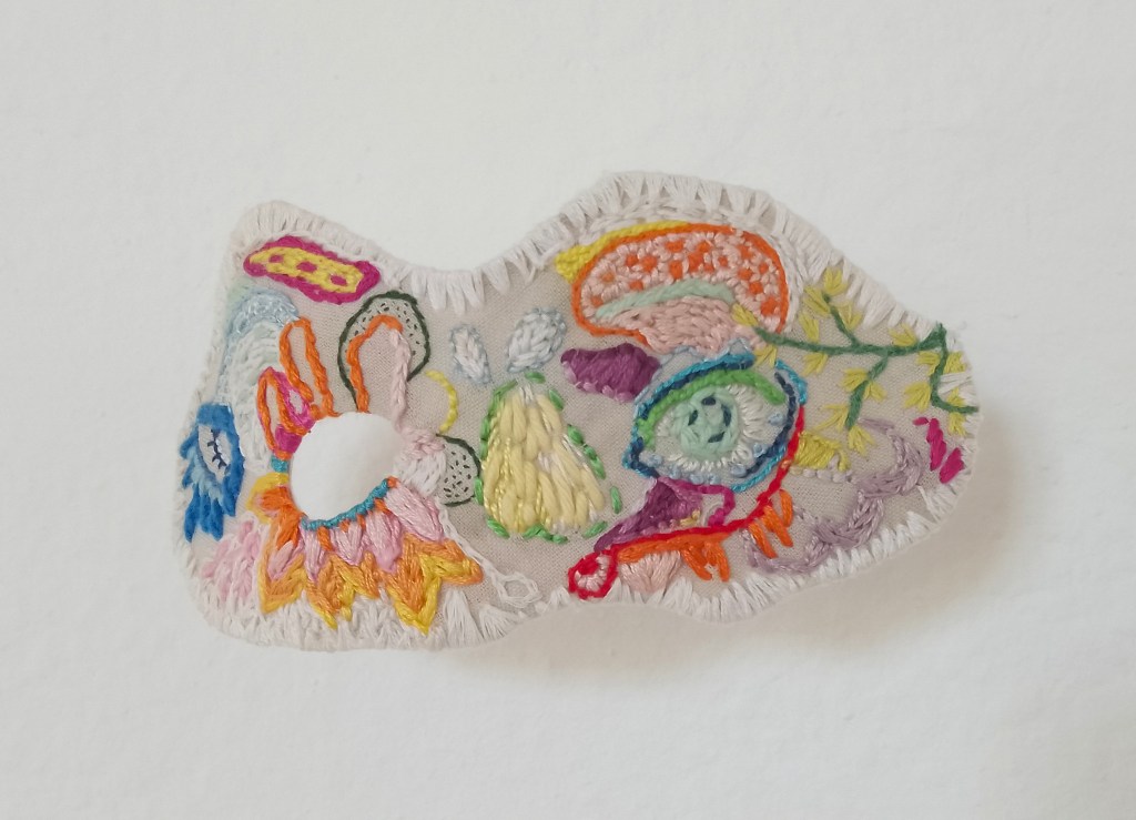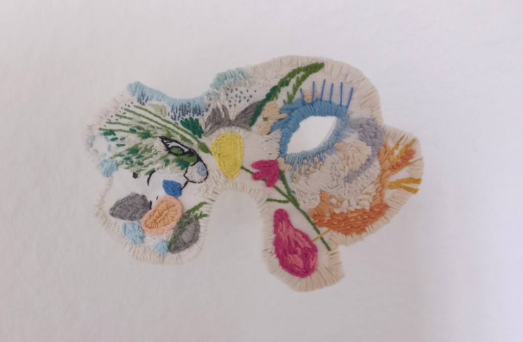 En m’inspirant de dessins d’enfants, d’illustrations jeunesse et de souvenirs, je travaille à partir de tissus brodés ayant appartenu aux générations passées. Je rebrode librement et forme de petits masques, destinés à être placés à hauteur d’enfant. Je souhaite interpeller sur le sort réservé à la perception des enfants et à leur parole dans le monde des adultes, notamment dans les questions de violences intra-familiales. La forme de masques interroge la notion de regard, de témoin, comme un jeu de miroirs: Regarde, je te vois.